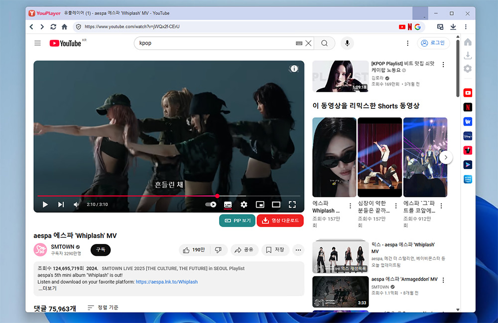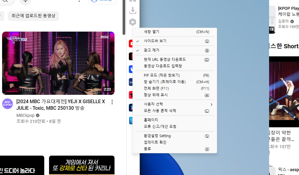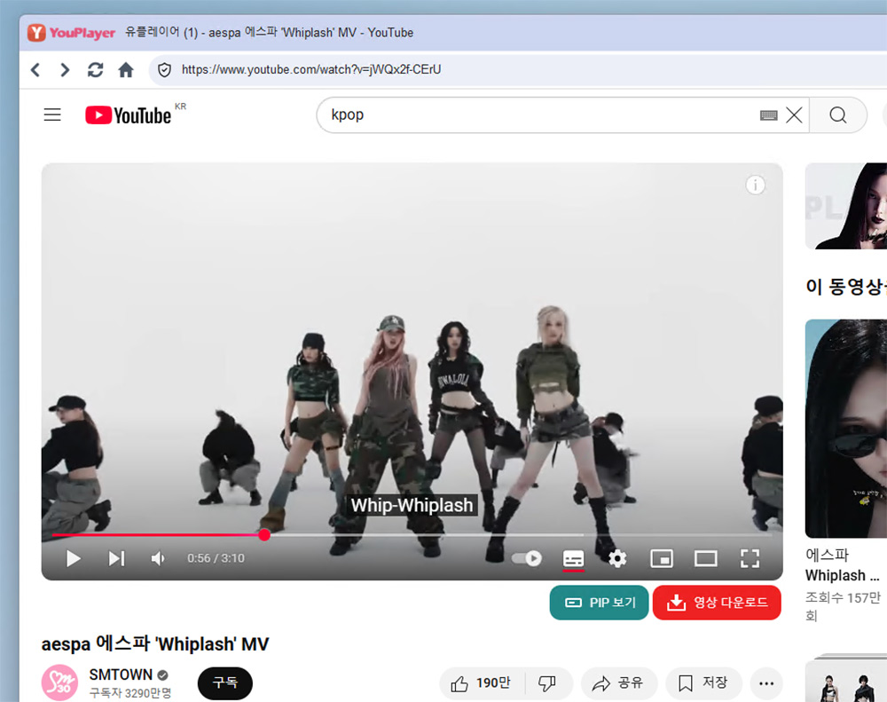 보조 모니터 등으로 영상을 보다보면 그냥 깔끔하게 영상만 보고 싶은 경우도 있는데요. 이때는 영상 아래에 PIP보기를 선택하면 됩니다.