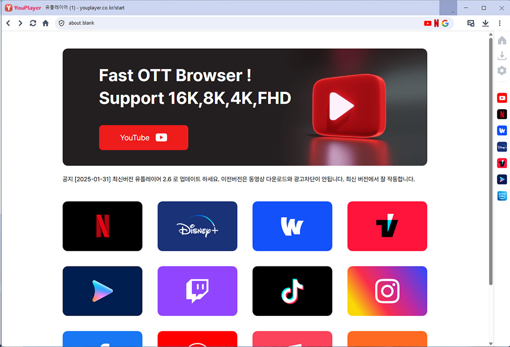 유튜브 영상 다운로드를 위해서 유플레이어를 설치 후 실행해보면 메인페이지에 유튜브와 넷플릭스 디즈니 등 간단하게 영상 스트리밍 사이트로 바로 접근할 수 있는 단축아이콘이 아닙니다.