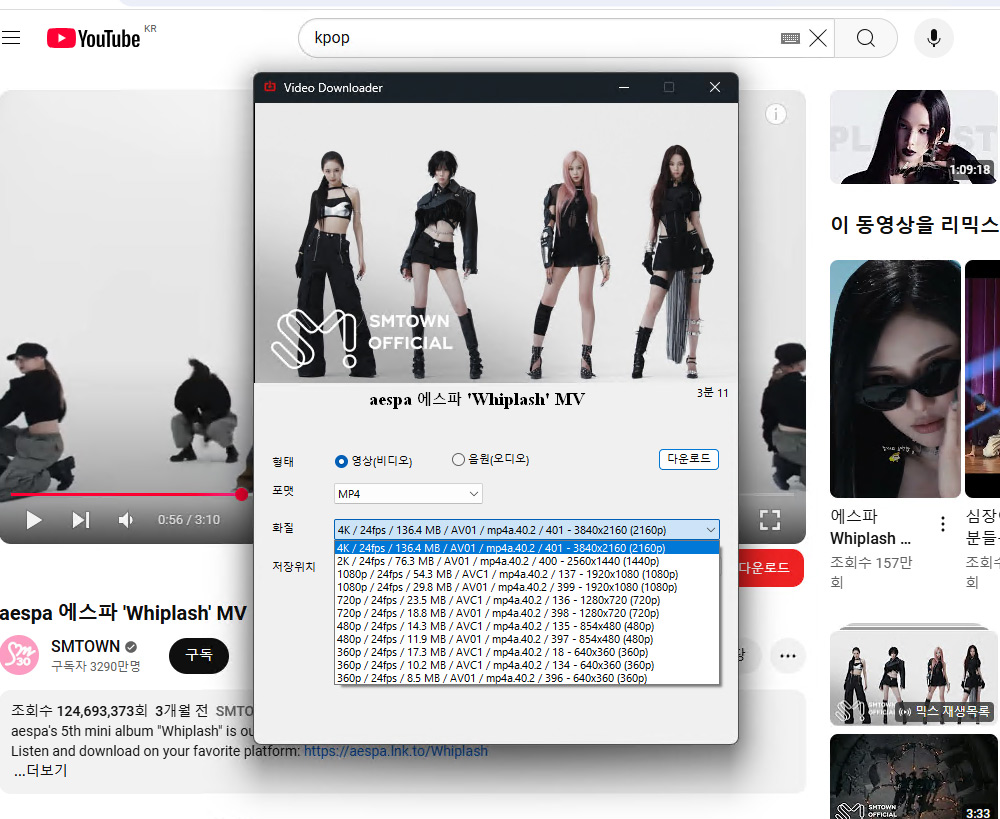 포멧도 선택 가능하고 화질도 선택해서 고화질로 다운로드 가능합니다.