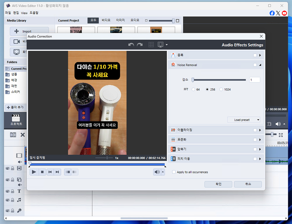 오디오 보정 부분도 마찬가지 였습니다. 창이 새로 뜨는것도 불편하네, 설정하는 부분 미리듣기도 첫부분으로 자동으로 이동합니다. 왜이렇게 만들었는지 좀 이해가 안되지만 의도된 것 같긴 합니다. 인터페이스랑 여러 부분이 마음에 들었지만, 뭔가 쓰면서 작업이 매끄럽지 않은 느낌이 계속 들어서 좀 아쉬웠습니다.