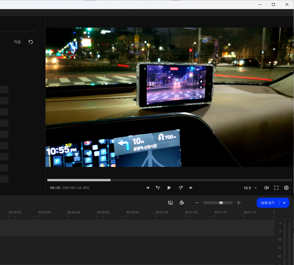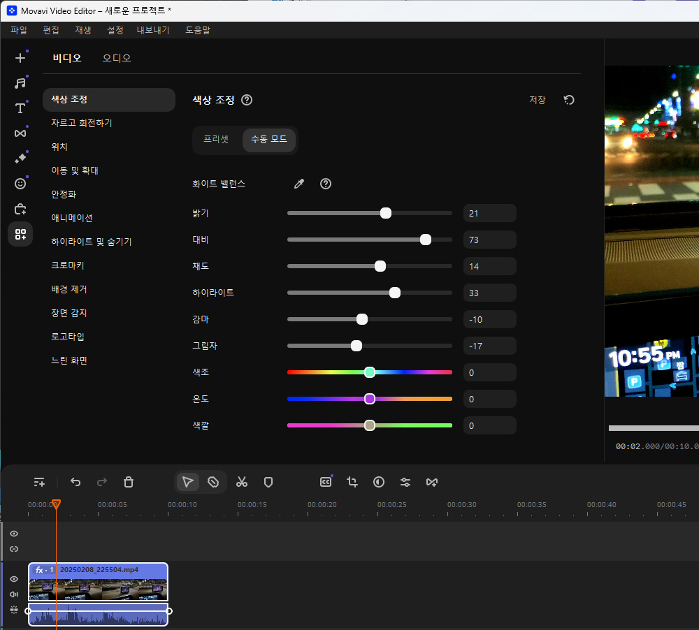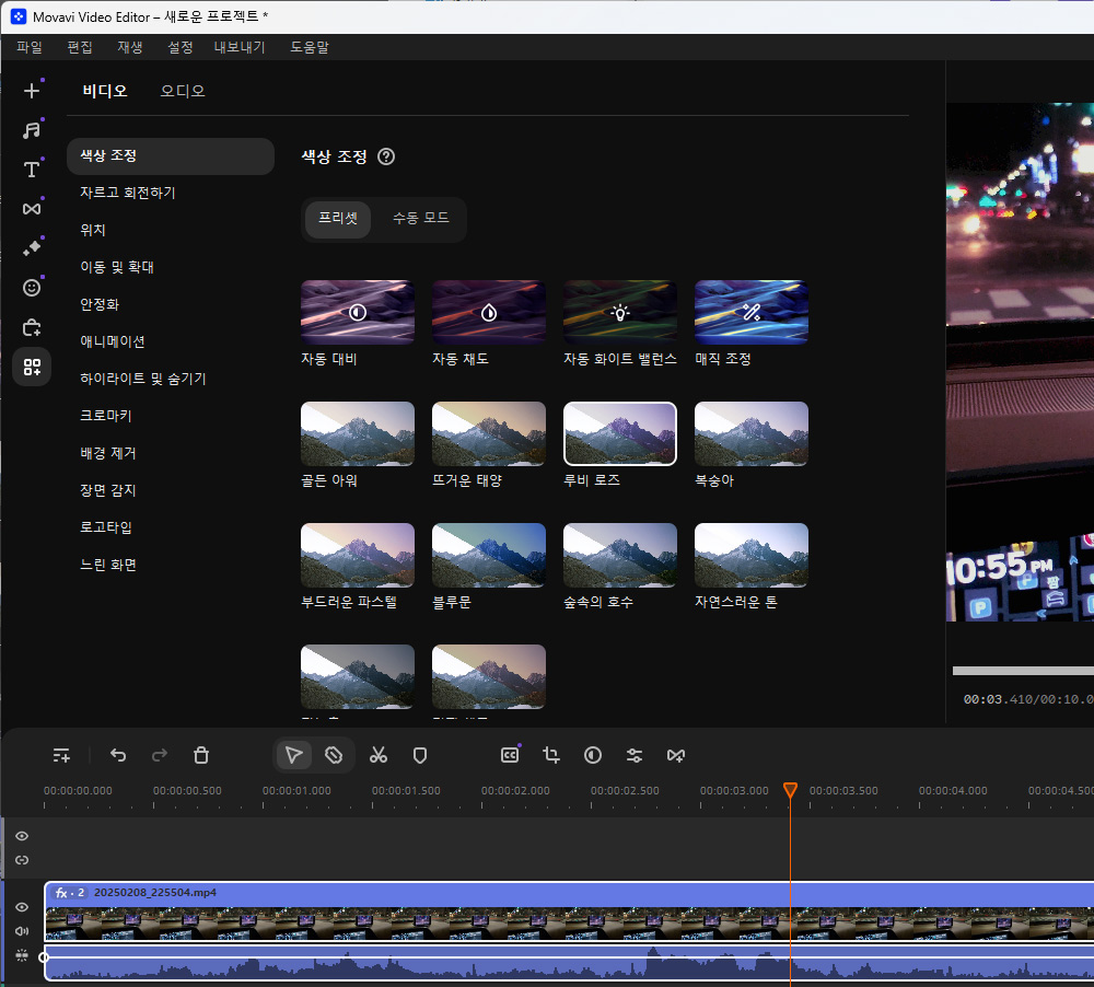 영상이 너무 흐리거나 또는 어둡게 촬영된 경우에는 왼쪽 메뉴 중 가장 아래에 있는 메뉴를 선택해서 수정이 가능합니다. 색상 조정에서 간단하게 대비, 채도, 화이트밸런스를 자동조정을 할 수 있습니다. 너무 심하게 어둡거나 이상하게 나온 영상 경우에는 자동 조정을 통해서 간단하게 보정이 가능합니다.