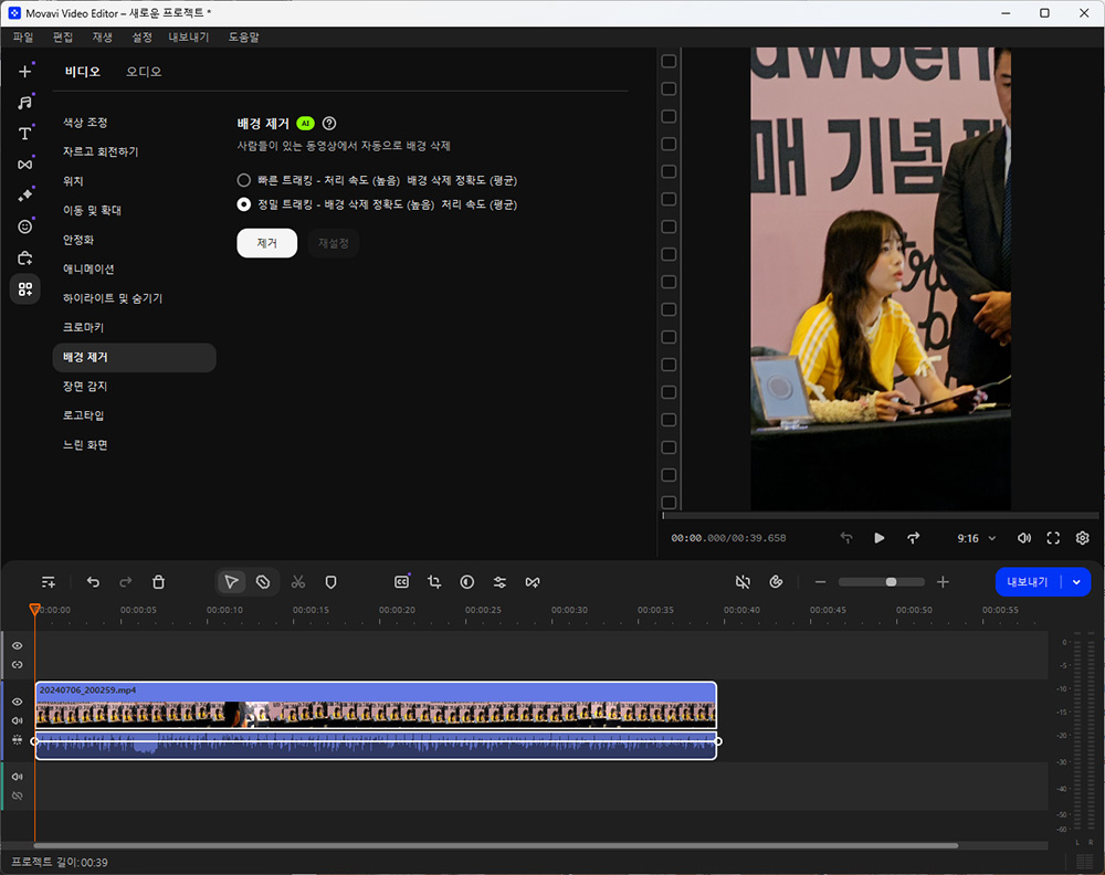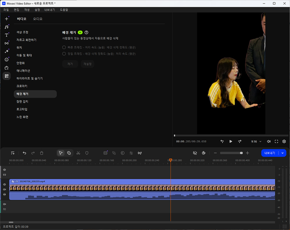 배경 제거도 가능합니다. 영상 편집 프로그램에서 피사체 외에 다른 배경을 제거하는 방법은 여러가지가 있는데요. 요즘은 AI가 그것을 대신하고 있습니다. 일일이 어렵게 배경을 지우는 번거로운 작업을 쓰지 않고 자동으로 알아서 배경을 지워주는 것이죠.