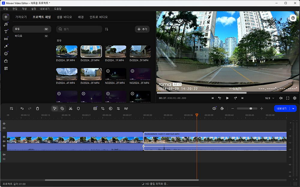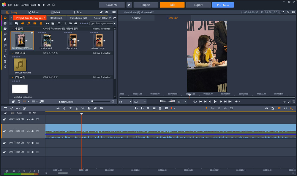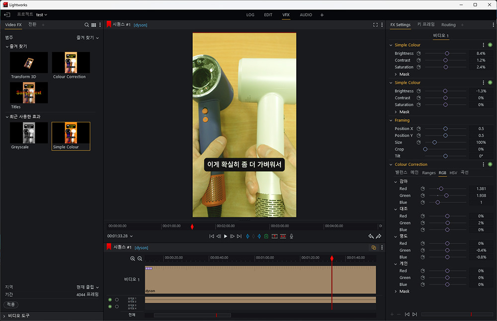 간단히 영상 보정하는 부분은 너무 괜찮았는데요. 세세한 옵션도 제공하고 프리셋도 꽤 많이 제공합니다. 아쉽다면 완전 한글화가 되어있었으면 하는 바램이 있더군요. 그리고 AI를 활용하는 자동화기능 특히 자막 부분이나 배경을 지워주는 최근 기능등은 제공하진 않습니다. 그리고 가장 아쉽던건 타임라인에 내용이 들어갔을 때 미리보기 이미지가 연속으로 있어서 대략 어느 장면인지 파악이 가능해야하는데 그게 안되네요. 클립을 제 경우에는 많이 넣어서 연속으로 내용을 연결해서 만드는 편인데 이게 첫부분 끝부분 이미지만 대략 나와서 어느 부분 클립인지 파악하려면 매번 클릭을 해서 파악해야합니다.