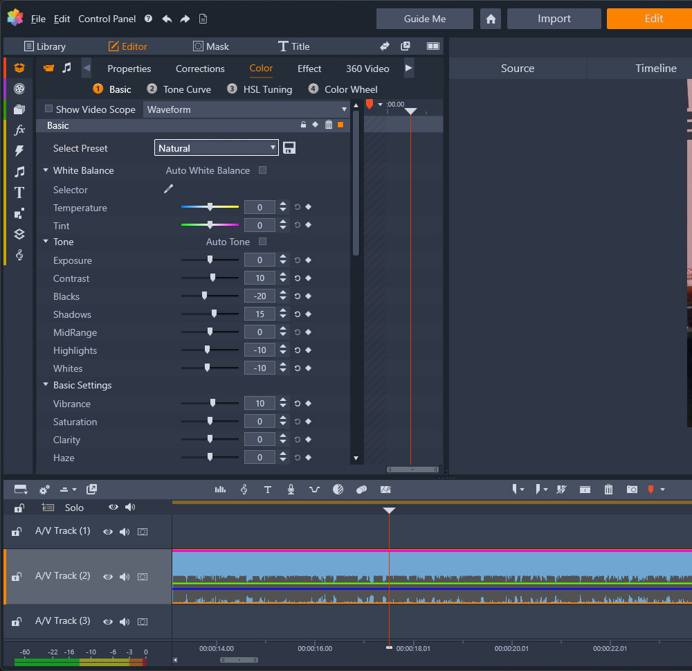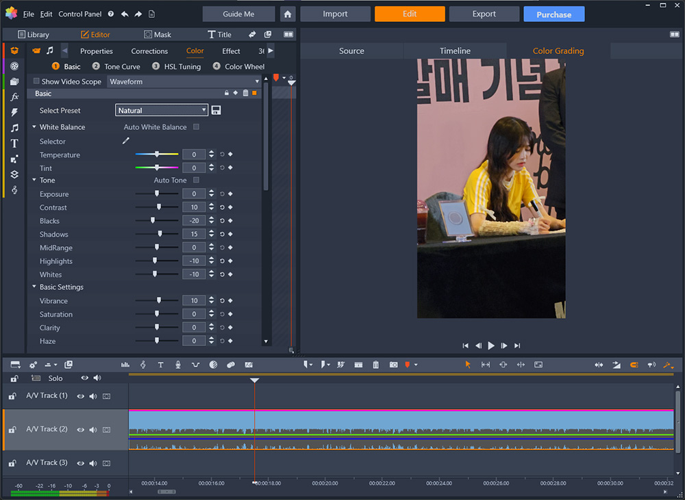 컬러 등은 프리셋을 통해서 간단하게 설정하는게 가능하긴 했는데요. 다만 타임라인에 휠을 통해서 확대 축소가 되진 않아서 그게 좀 아쉬웠고, 기능이 많아서 그런지 메뉴얼을 좀 봐야 기능을 알것 같은것도 많았는데요. 물론 이건 단점이라고 볼 수는 없지만 타임라인 위에 있는 버튼들이 많긴 한데. 문제는 어떤 역할을 하는지 한눈에 안들어와서 결국 툴팁을 하나씩 봐야 하더군요.