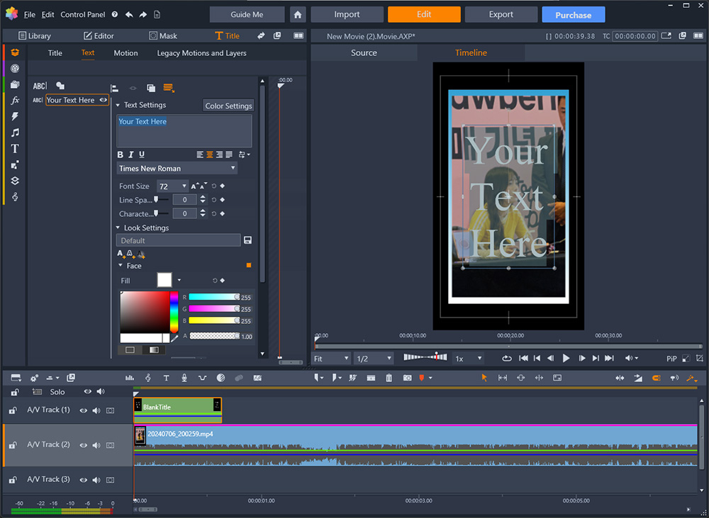 타이틀을 넣거나 자막을 넣는 기능을 활용할 수 있는데요. 이것도 아쉽다면 일반적으로 할 수 있는 기본 기능만 제공할 뿐, 자막처럼 배경을 넣거나 자동 자막을 생성해주거나 그런 기능이 없는게 아쉬웠습니다.