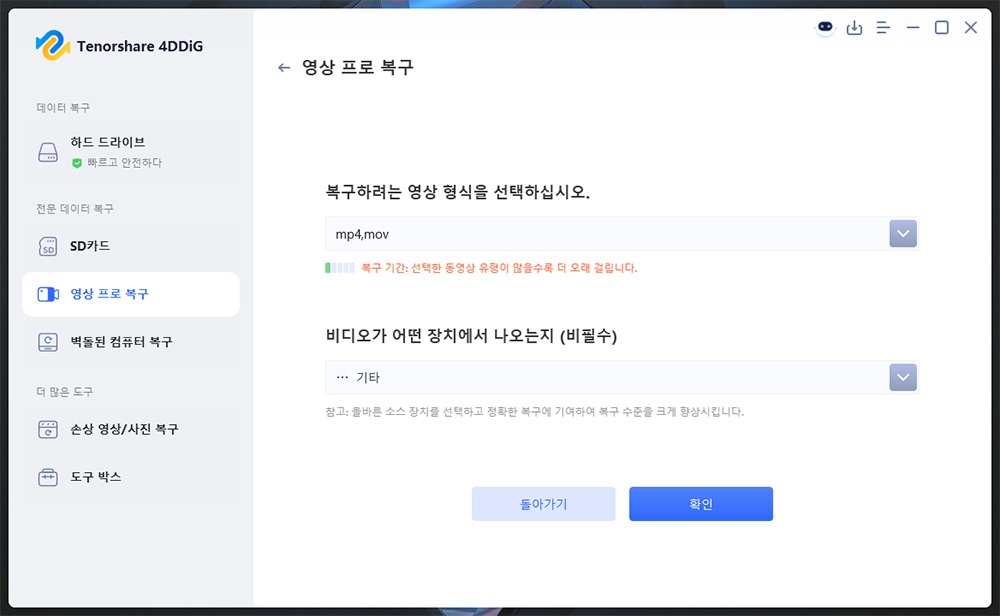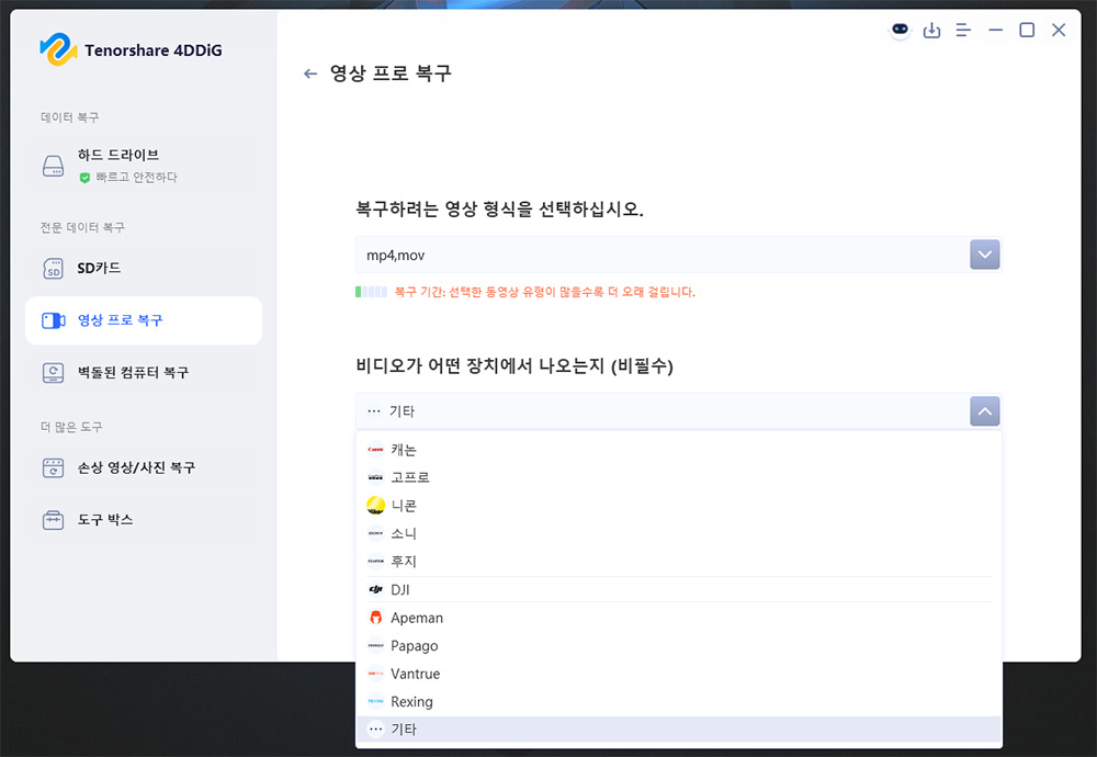 복구하려는 영상 형식을 선택하고 비디오를 찍은 장치를 선택 합니다.