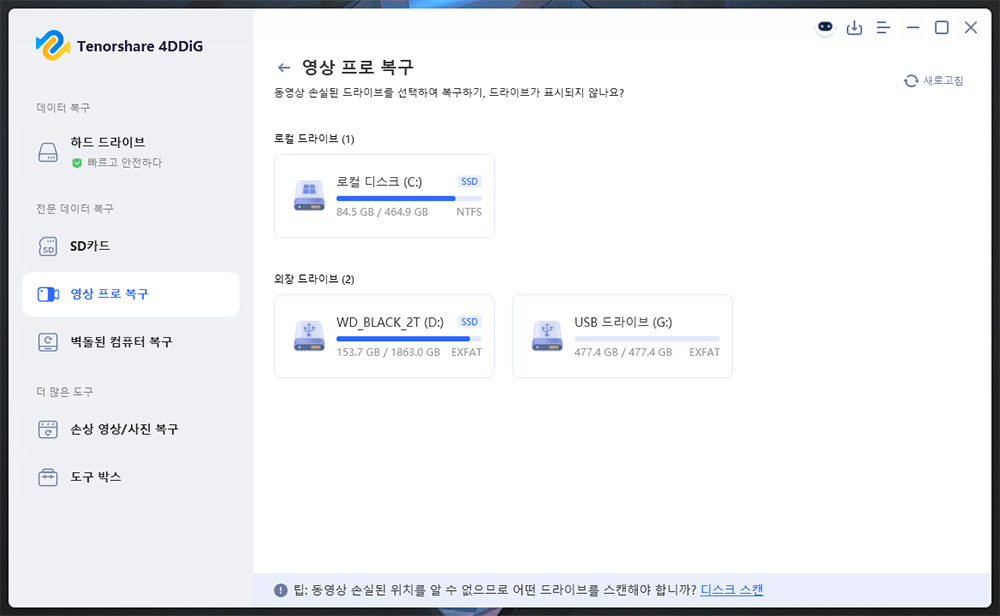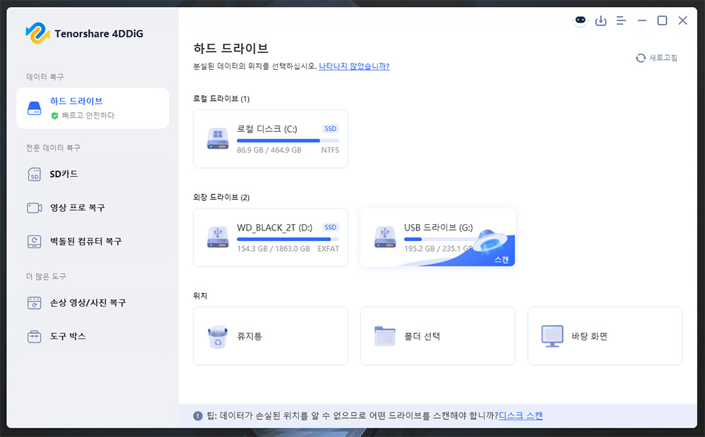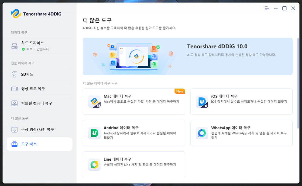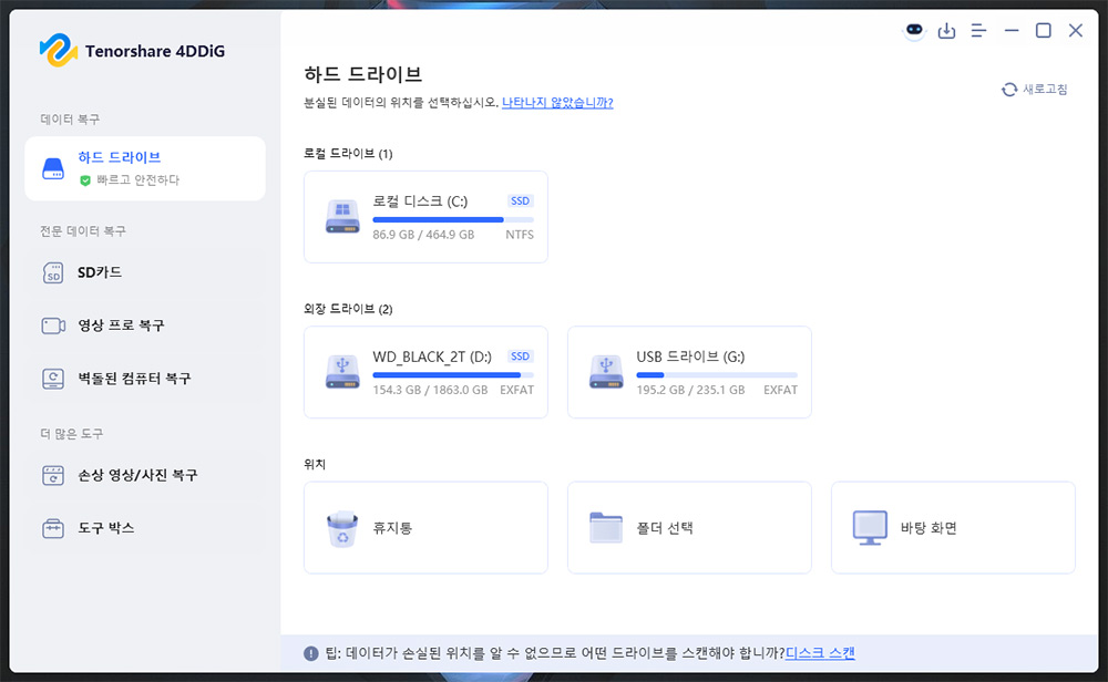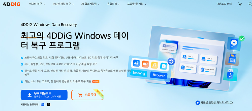 Tenorshare 4DDiG Windows 데이터 복구를 다운로드하여 하드 드라이브, SD 카드, USB, 분실된 파티션 등에서 데이터를 복구하세요. 워드, 엑셀, 사진, 영상 등 2000개 이상의 파일 유형을 복구할 수 있습니