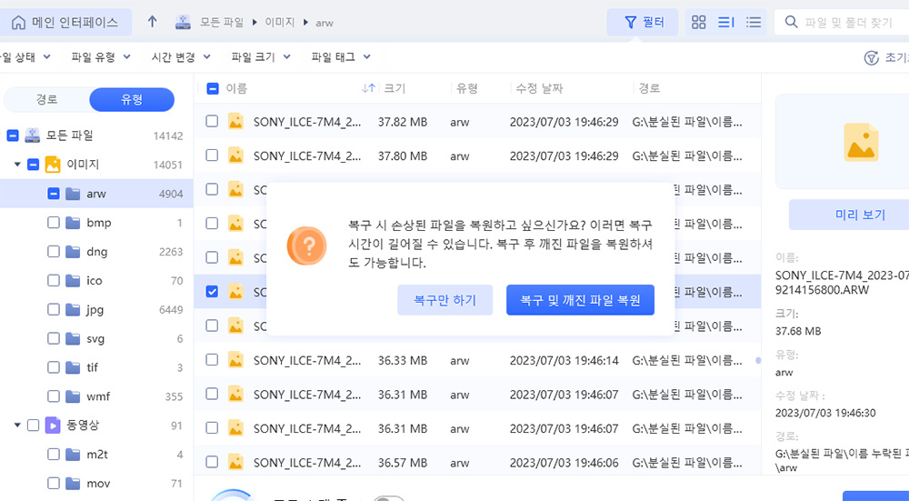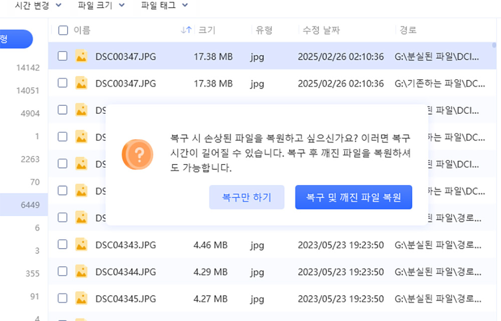 복구시 복구만 할 수 도 있고, 만약 이미지가 복구했는데도 열어도 이미지가 보이지 않거나 정상적이지 않는 경우 복구 및 깨진 파일 복원을 통해서 살리는 것이 가능합니다.