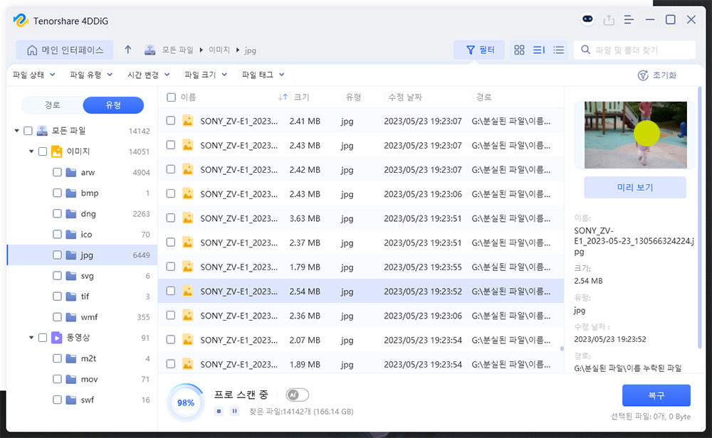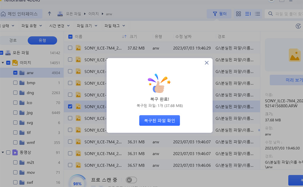 이미지와 동영상이 스캔이 꽤 많이 되었습니다. 포멧을 했다고 해도 이전에 찍어뒀던 이미지가 대부분 복구가 가능하다는 뜻이죠.