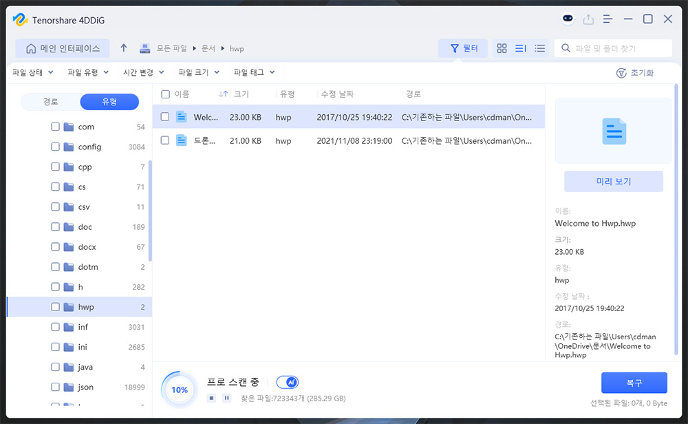 hwp 한글파일도 복구가 됩니다. 일부 프로그램은 문서에 hwp가 빠져있어서 스캔이 안되는 경우도 있는데 이 프로그램은 한글 파일도 복구가 가능합니다.