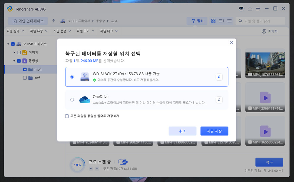 복구를 위해서는 복구하고 싶은 파일을 선택 후 오른쪽 아래 복구 버튼을 누르면 됩니다. 그러면 어디에 복구를 할 수 있는지 미디어를 선택하는 부분이 뜹니다. 저는 외장하드로 복구를 시도해 보겠습니다. 지금 저장 버튼을 누릅니다.