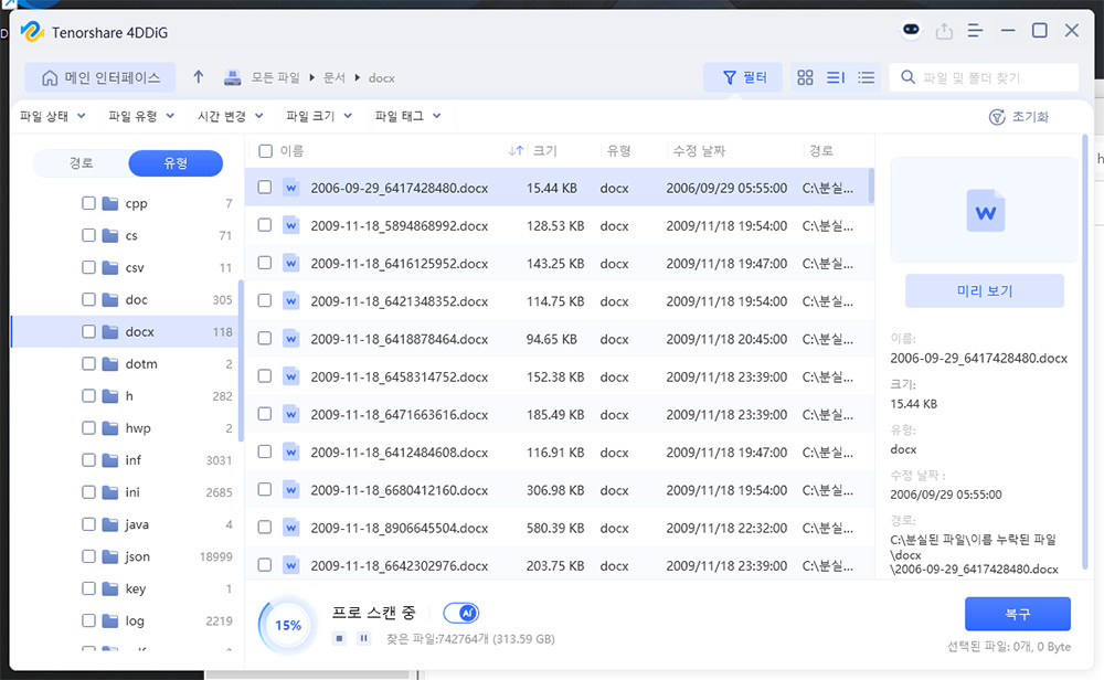 사용하는 운영체제의 C드라이브에서 지워진 문서파일도 스캔을 해 봤습니다. 여러가지 타입의 문서파일이 모두 스캔이 됩니다.