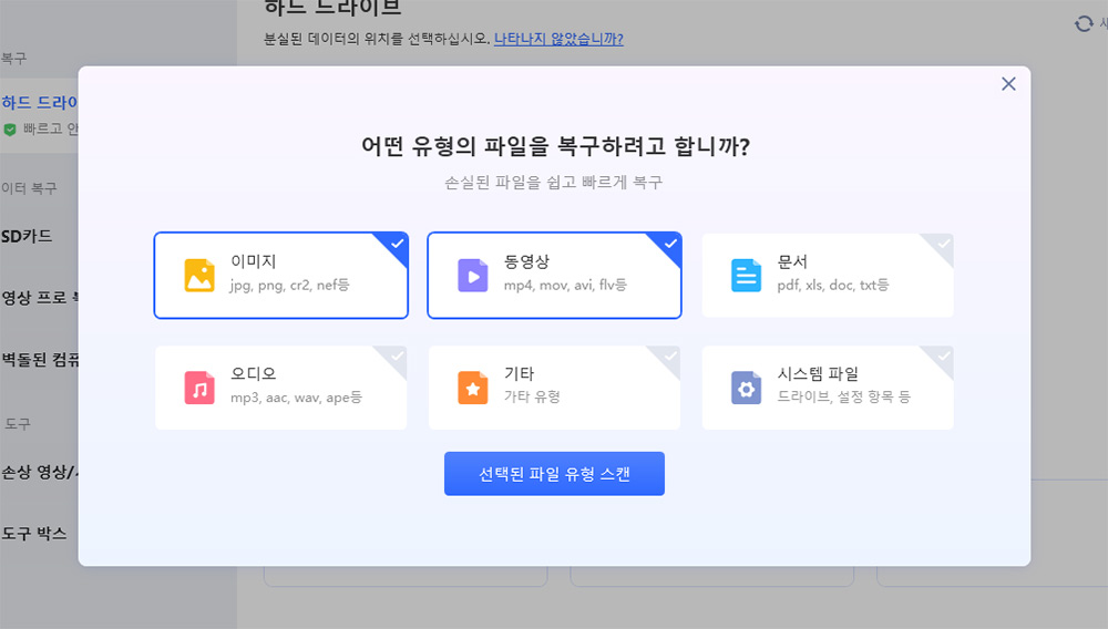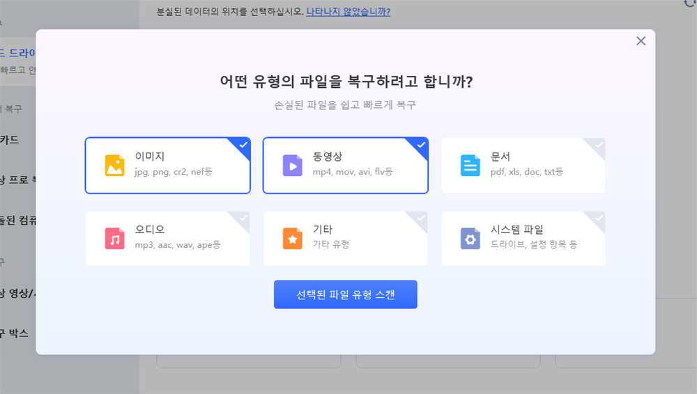 스캔 시도 할 경우 어떤 파일을 복구할 지 메뉴가 뜹니다. 제 경우에는 이미지와 동영상만 선택했습니다. 필요한 파일 종류를 선택할 경우 복구 시간을 단축할 수 있습니다.