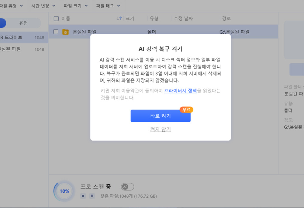 블랙박스 경우 덮어 쓰는 파일도 있으므로 최대한 복구를 위해서 프로 스캔도 켜봅니다. AI 강력 복구 켜기를 하면 일부 파일을 서버로 올려서 강력 스캔을 시도 합니다.