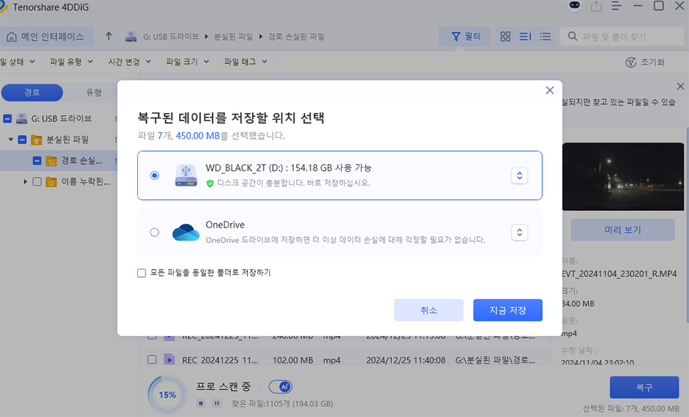 복구할 위치를 외장 하드로 선택 후 복구를 시도해봅니다.