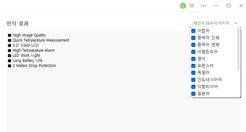 왼쪽에는 캡처한 이미지를 번역해서 바로 보여주고, 오른편에는 번역전의 추출된 내용과, 원하는 언어로 번역된 내용을 볼 수 있습니다.