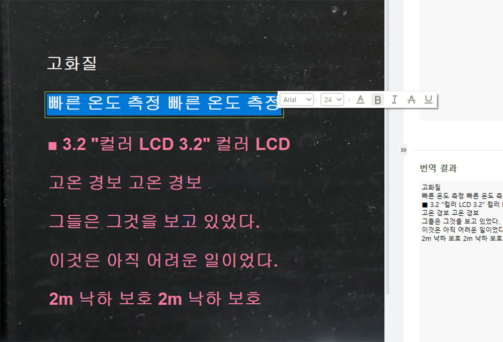 그리고 이렇게 번역된 내용은 그대로 활용이 가능한데, 만약 글자가 내용이 틀리면, 원하는 내용을 글자를 바꾸거나 글꼴 및 크기등도 조정이 가능합니다.