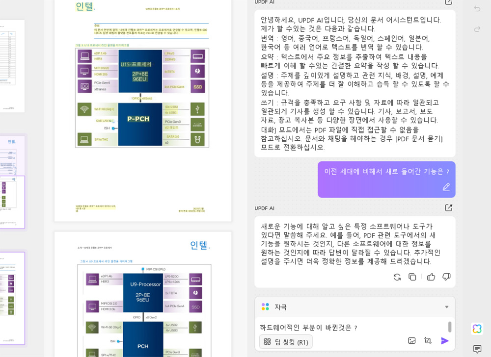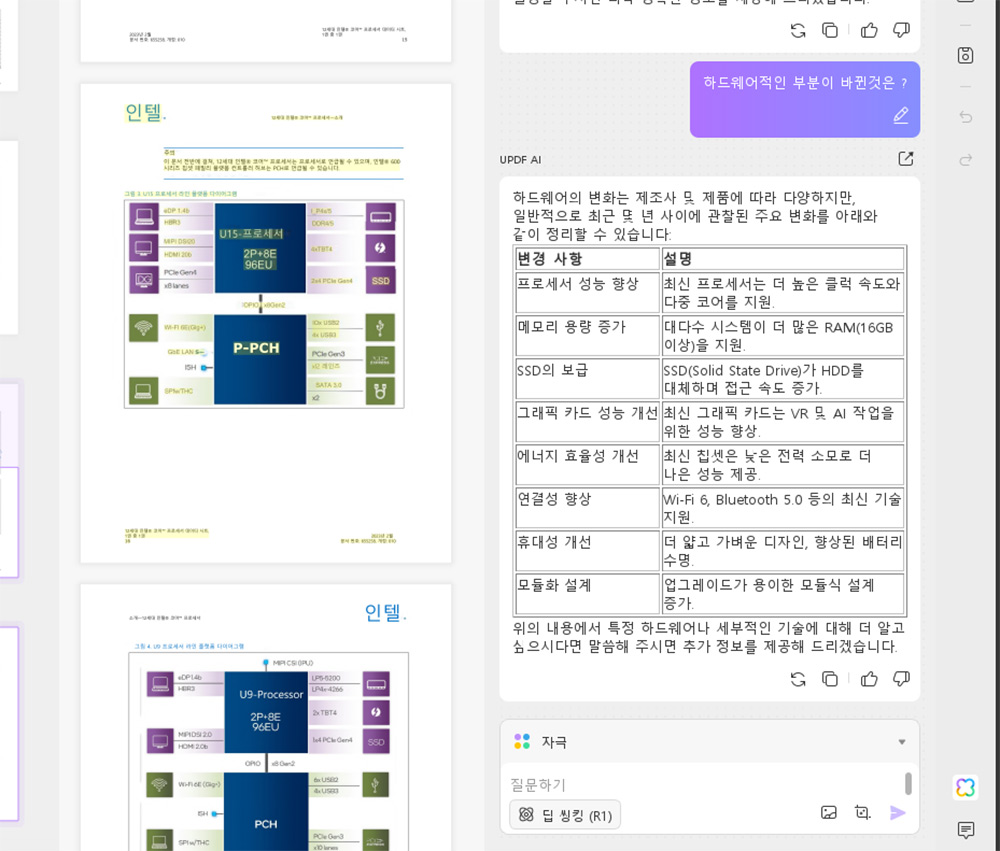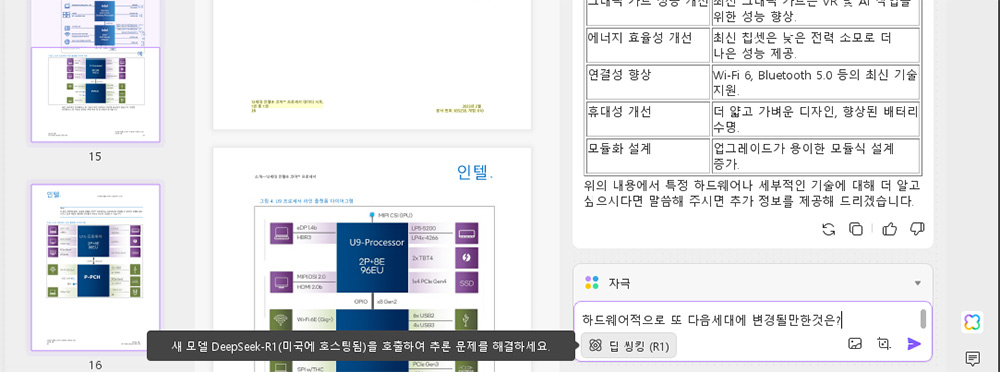 근데 이 문서를 기반으로 앞으로 새로 나올 하드웨어어세 변경될만한것도 물어봤는데요. 근데 여기에서 좀 더 추론적인 대답을 원하면 딥 씽킹을 선택하면 됩니다. 그러면 DeepSeek R1 기반으로 분석해서 알려줍니다. 처음에는 설마 이것까지 대답해줄까 싶었는데...