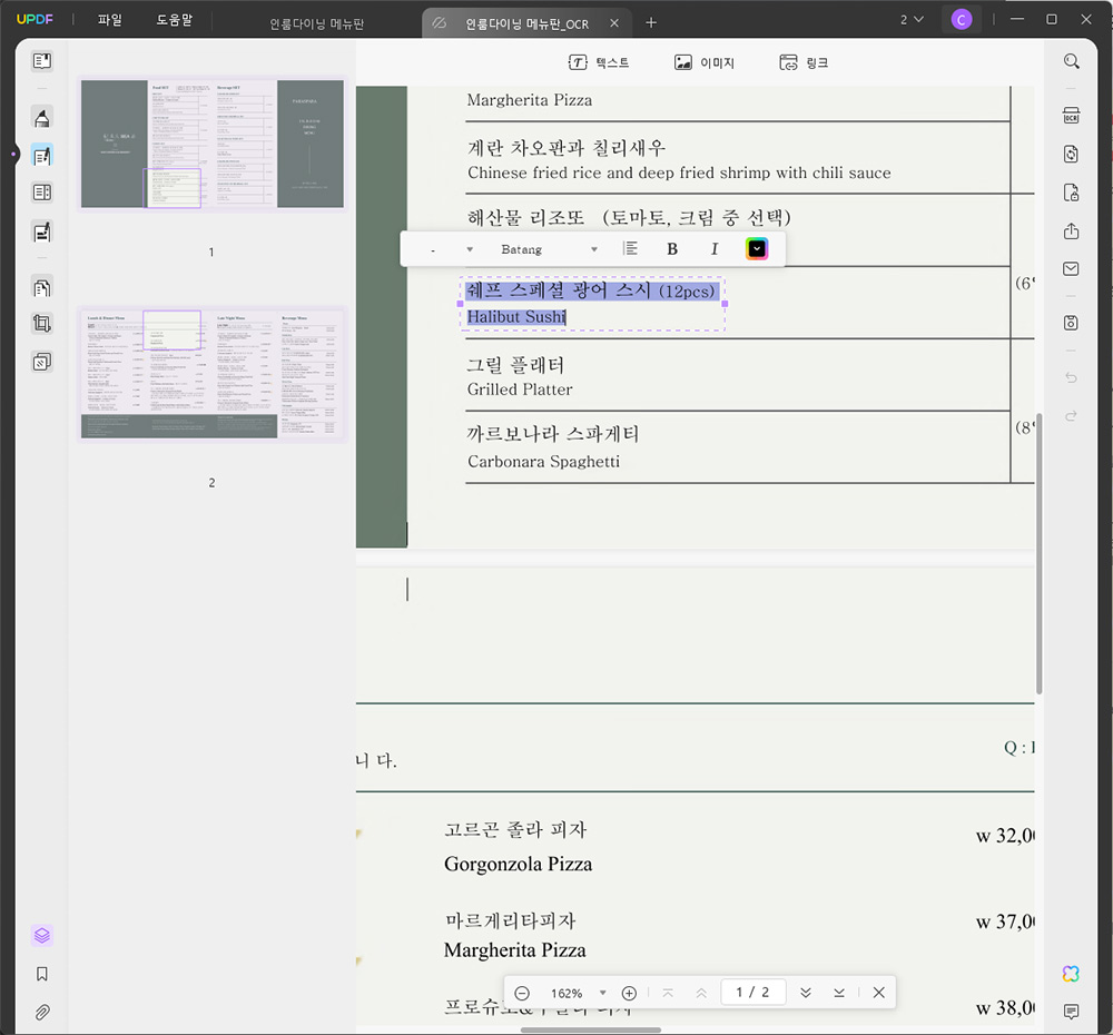 이번에는 그림으로된 메뉴판을 PDF로 만든것을 예시로 불러와봤는데요. 드래그 해도 글자가 인식이 안된 상태 입니다.