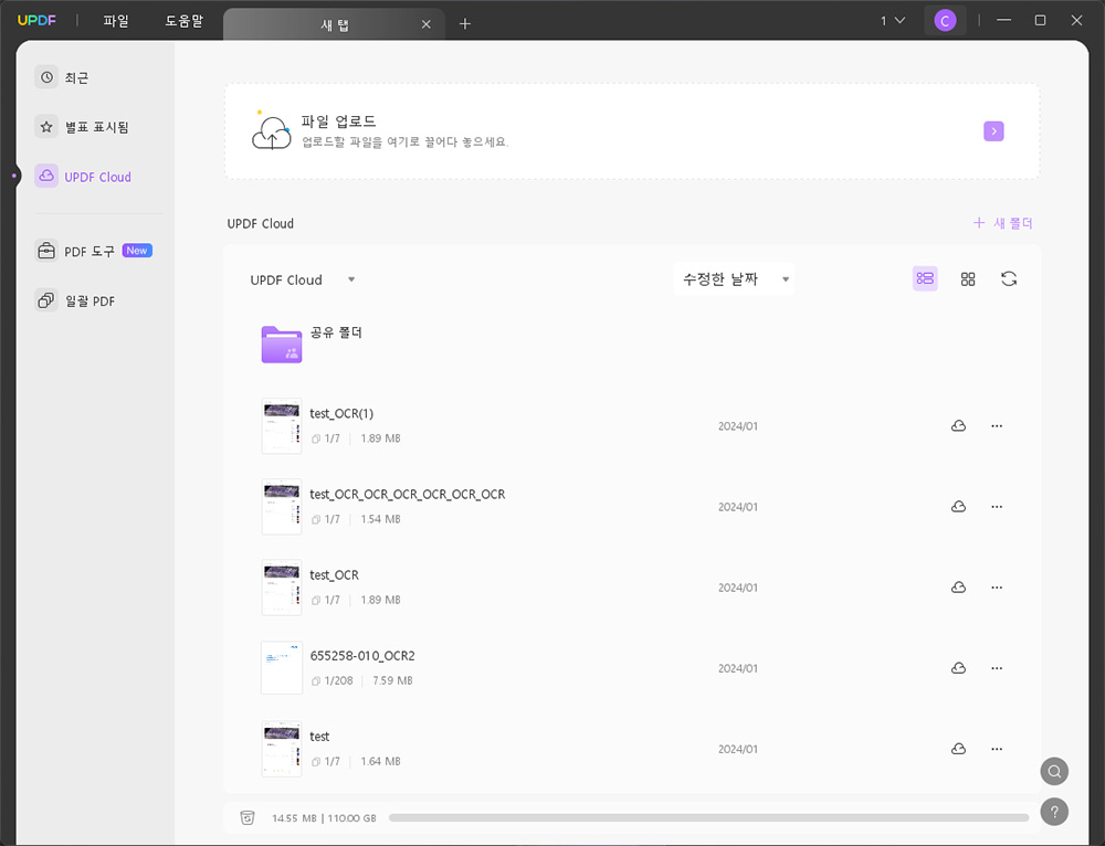 UPDF 클라우드도 사용할 수 있는데요. 문서들을 여기 저장해놓고 불러와서 편집을 할 수 있습니다. 즉 편집하다가 밖에 나가더라도 이어서 작업을 할 수 가 있죠.