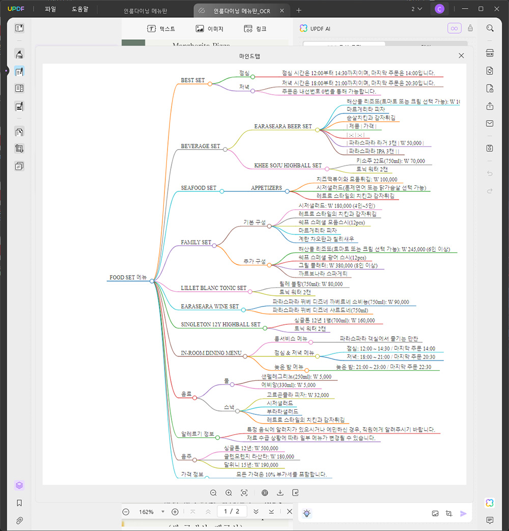 그리고 추출한 내용에 대해서 마인드맵도 그려줍니다. 마인드맵을 그려야 하는 차트내용이나 메뉴 같은 경우 이렇게 하면 한눈에 잘 들어오고 내용을 좀 더 다채롭게 꾸밀 수 있기 때문에 좋을듯 합니다.