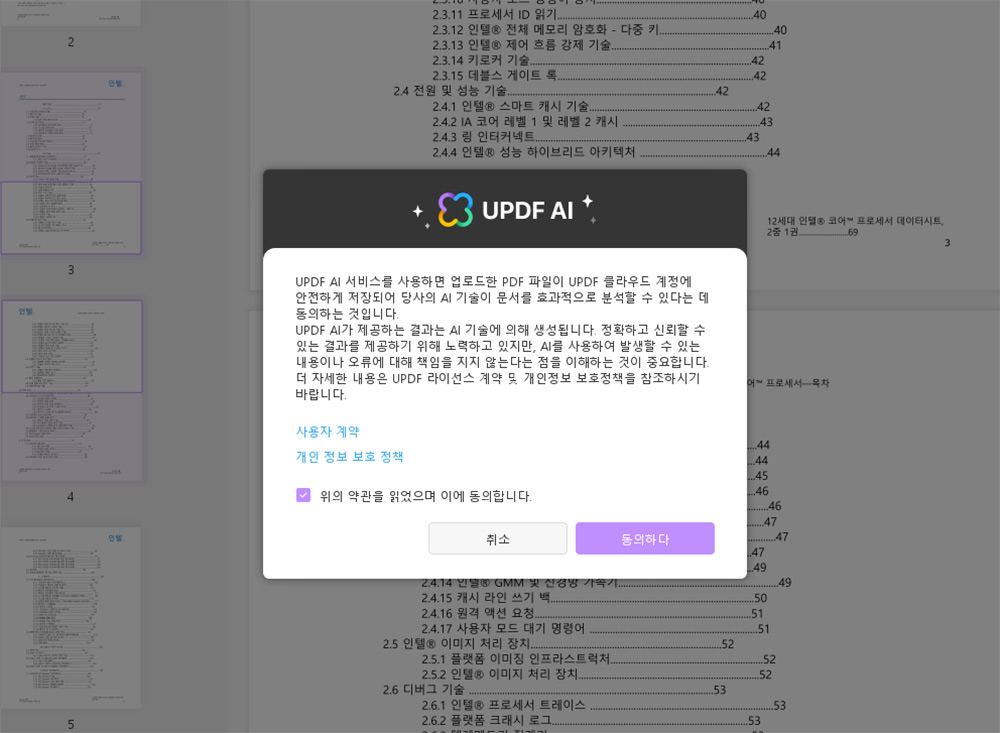 UPDF AI를 이용하면, 파일을 클라우드에 업로드하게 되며 파일을 서버에서 분석을 해서 더 정확한 정보를 보여주게 합니다. 물론 파일을 서버로 올리는 과정이 있으므로 그것에 대한 동의를 구하는 부분이 나옵니다.개인정보 보호정책을 따른다고 나오긴 합니다.