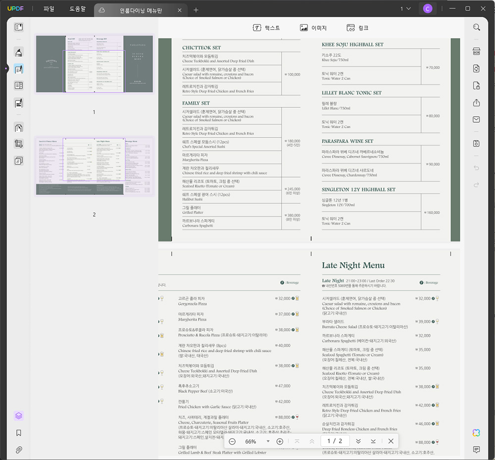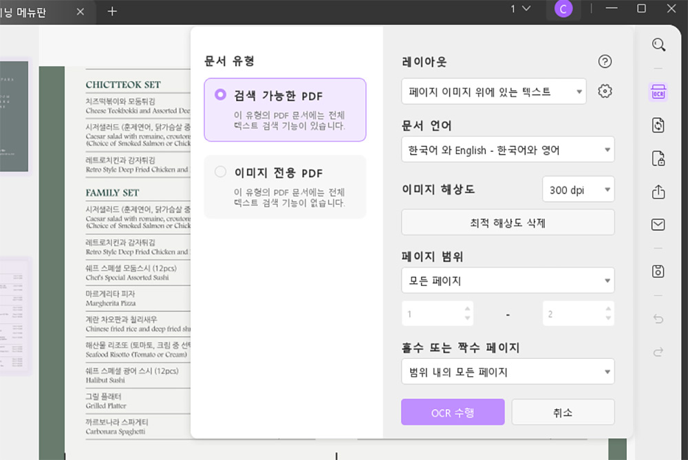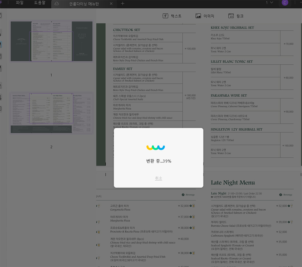 이번에는 그림으로된 메뉴판을 PDF로 만든것을 예시로 불러와봤는데요. 드래그 해도 글자가 인식이 안된 상태 입니다.