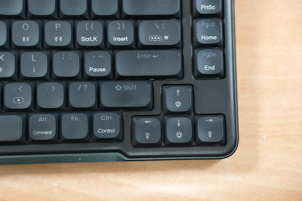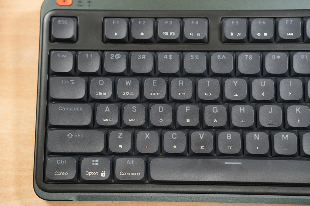 키보드는 각인이 좀 특이한데요. 윈도우와 맥에서 모두 사용할 수 있는 형태로 되어있습니다. 키보드 스페이스바 아래 부분에는 살짝 낮게 깍여 있어서 전체적으로 낮은 키보드 본체 부분에 손을 올리기 편하게 디자인 되어 있습니다.