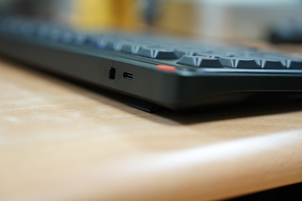 로우프로파일 키캡으로 키캡 자체도 전체적으로 높이가 낮은데요. 본체도 비교적 낮은 형태로 전체적으로 더 낮은 느낑이 듭니다. 덕분에 휴대성도 좀 더 좋아지고 , 타건할 때 키보드의 중앙 위치와 무관하게 전체적으로 키보드 타건할 때 느낌이 일정하다는 장점도 있습니다.