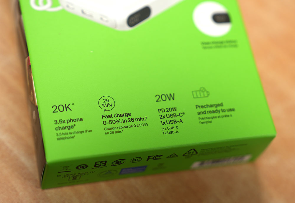 이 제품은 20000mAh 용량으로 아이폰을 3번 이상 충전할 수 있고, 0%에서 50%까지 26분만에 고속충전이 가능합니다. PD20W를 지원해서 아이폰이나 그것을 지원하는 스마트폰, 카메라, 디바이스 등을 빠르게 충전할 수 있습니다.