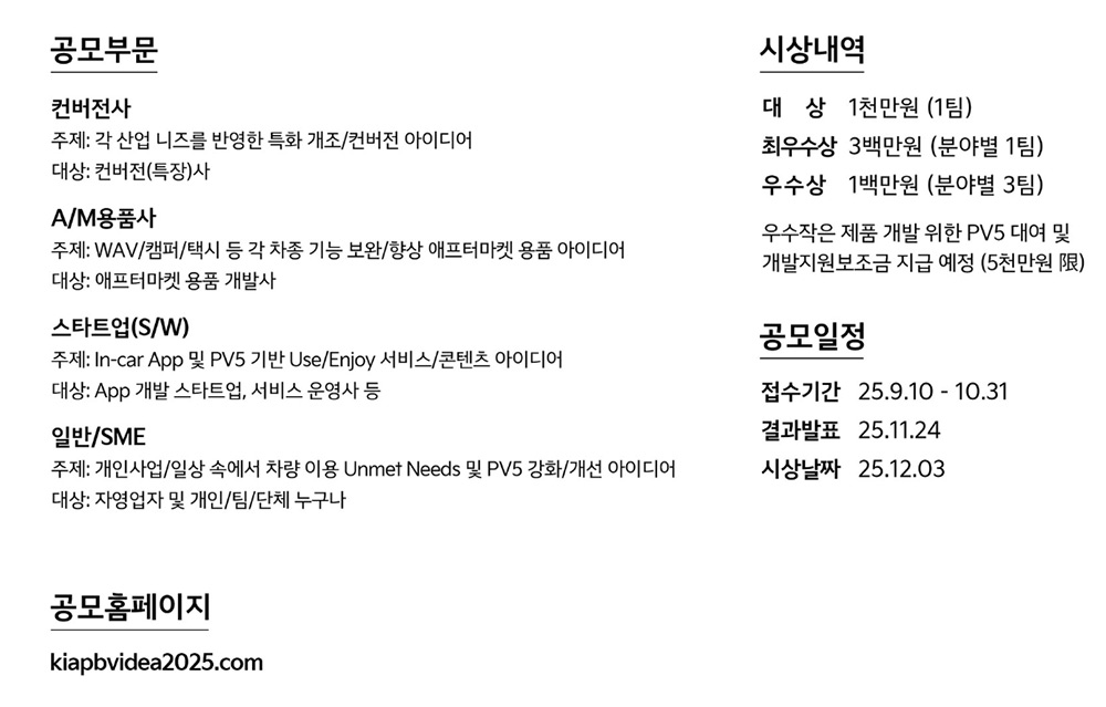 ‘PBV(Purpose Built Vehicle)’는 말 그대로 목적에 맞게 제작된 차량을 의미하는데요, 기아는 이 PBV를 통해 물류, 복지, 공유 이동수단 등 다양한 분야에서 혁신을 꾀하고 있습니다. 제4회 기아PBV아이디어 공모전은 바로 이 PBV를 활용한 아이디어를 모집하는 대회입니다. 기아 아이디어 공모전은 단순한 디자인 제안이 아니라, 사회적 문제 해결과 연결된 창의적 접근을 요구하는 점에서 더욱 의미가 깊습니다.