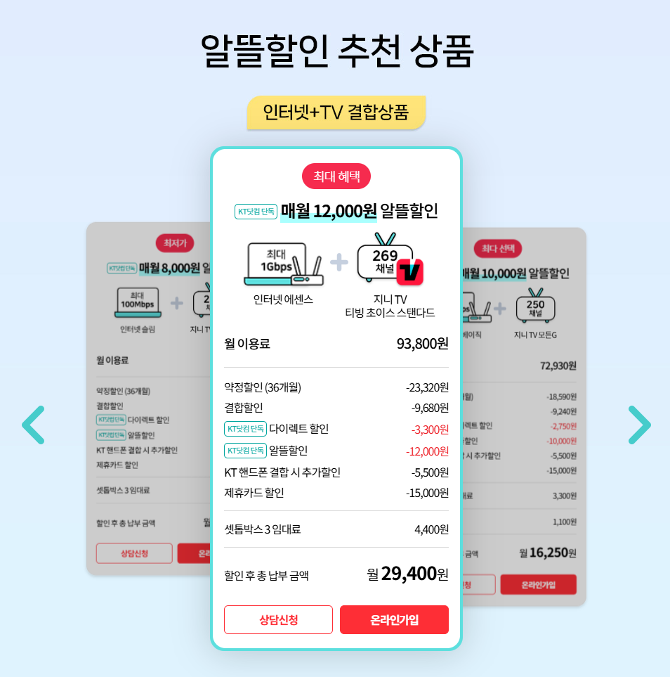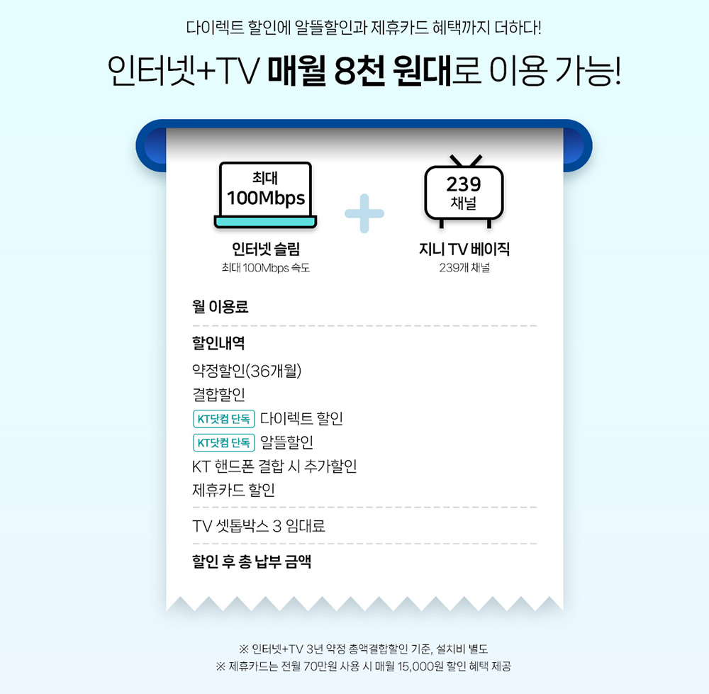 인터넷 + TV를 월 8천원대로! KT 결합할인과 제휴카드까지 더하면 더 저렴해요.