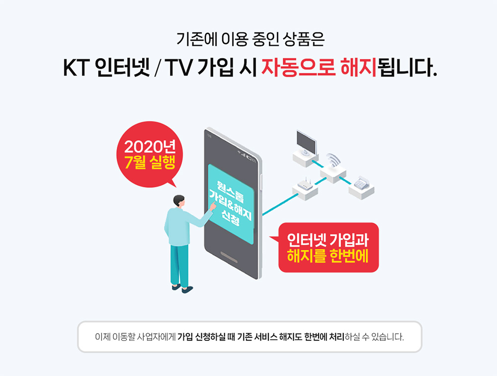 인터넷을 새로 신청하면 기존에 이용 중인 상품은 자동으로 해지가 됩니다. 2020년 7월부터 원스톱 가입&해지 신청 실행이 되어서 기존 인터넷 다른 거 쓴다고 해지 어떻게 하고 신청해야 하나 이런 고민은 안 해도 됩니다. 알아서 다 해줍니다.