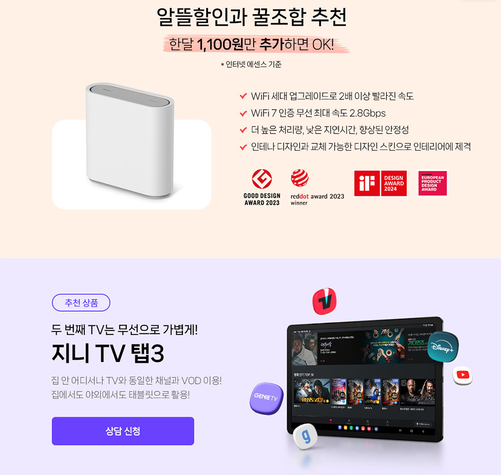 지니TV탭3와 WiFi 7D로 완성하는 홈엔터테인먼트! 알뜰할인과 찰떡궁합이에요.